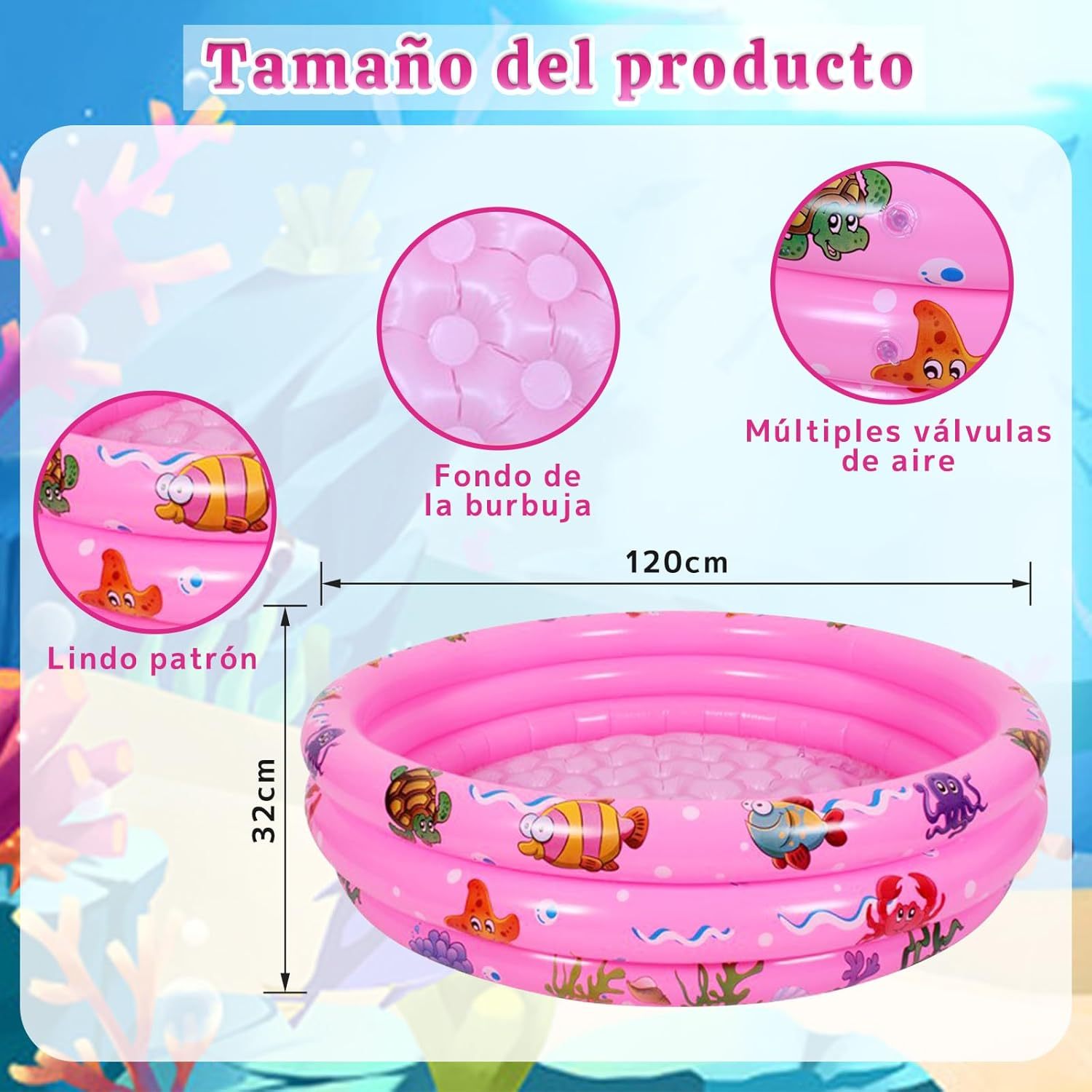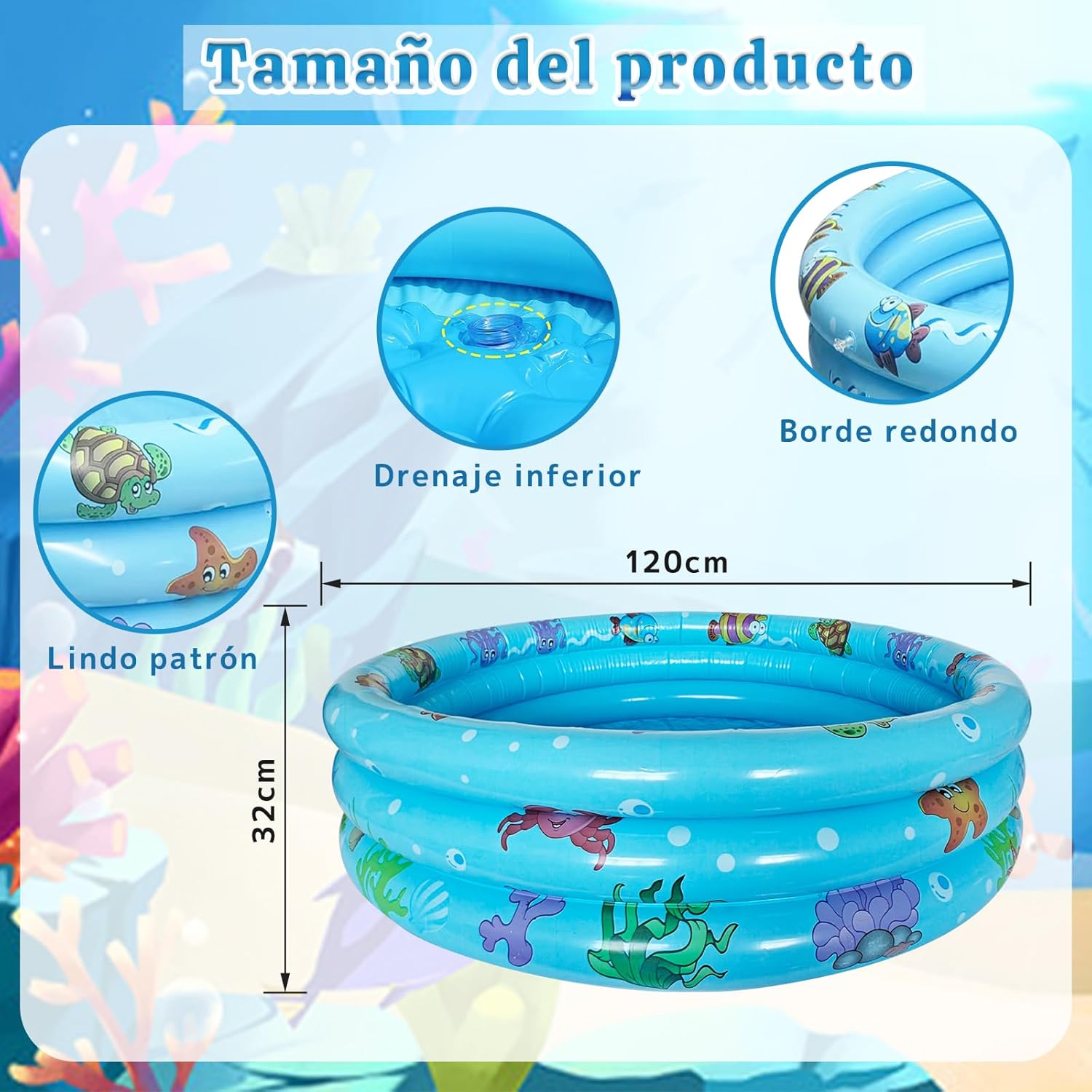 【Tamaño extra grande】Diámetro de la piscina 120 cm de diámetro 32cm de altura y puede contener hasta 28cm de agua. El nivel máximo de agua está marcado en la piscina, La piscina es apta para 3-7 niños y es perfecta para ayudar a los adolescentes y niños nadadores a ser independientes en el agua.