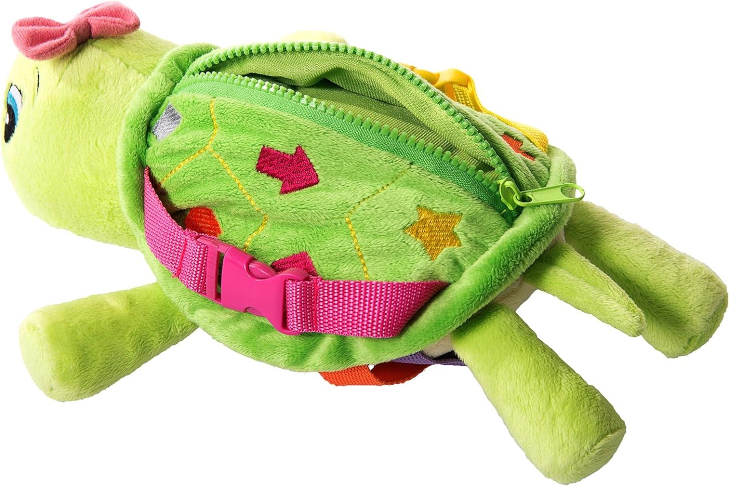 I'm Belle Turtle - The Buckle Toy . I'm loved by every girl and boy. My super soft plush is uniquely designed with colorful primary bold colors to appeal to any child's early fascination with buckles. Toddlers will not only learn to 'SNAP' and "CLICK' but also develop and strengthen fine motor skills, hand eye coordination, problem solving, and color recognition. My cuddly body is decorated with fun shapes and numbers to keep kids learning and entertained. I also have an easy-glide zipper with pocket to hide hidden treasures. I help kids learn and entertain them too. Whether it's counting to improve math skills, naming the shapes, zipping up and down, or snapping buckles there is plenty for kids to learn while on the go. Can't fit me in your luggage bag, suit case or carry on? Strap me on your stroller, diaper bag, shopping cart, car seat, or high chair. My favorite places to play are in the car, train, airplane, grocery store, and doctor waiting rooms. I'm also very popular for improving motor skills for special needs, autistic, and disabled children. I've been PROFESSIONALLY safety tested. And don't worry if I get dirty...I'm surface washable. I'm a great distraction for kids at the dentist; I'm better than a lollipop...and I don't cause cavities. I'm also lightweight and easy to hold for your little learners. Please oh please won't you order me. I'm the best buckle pal there could ever be.