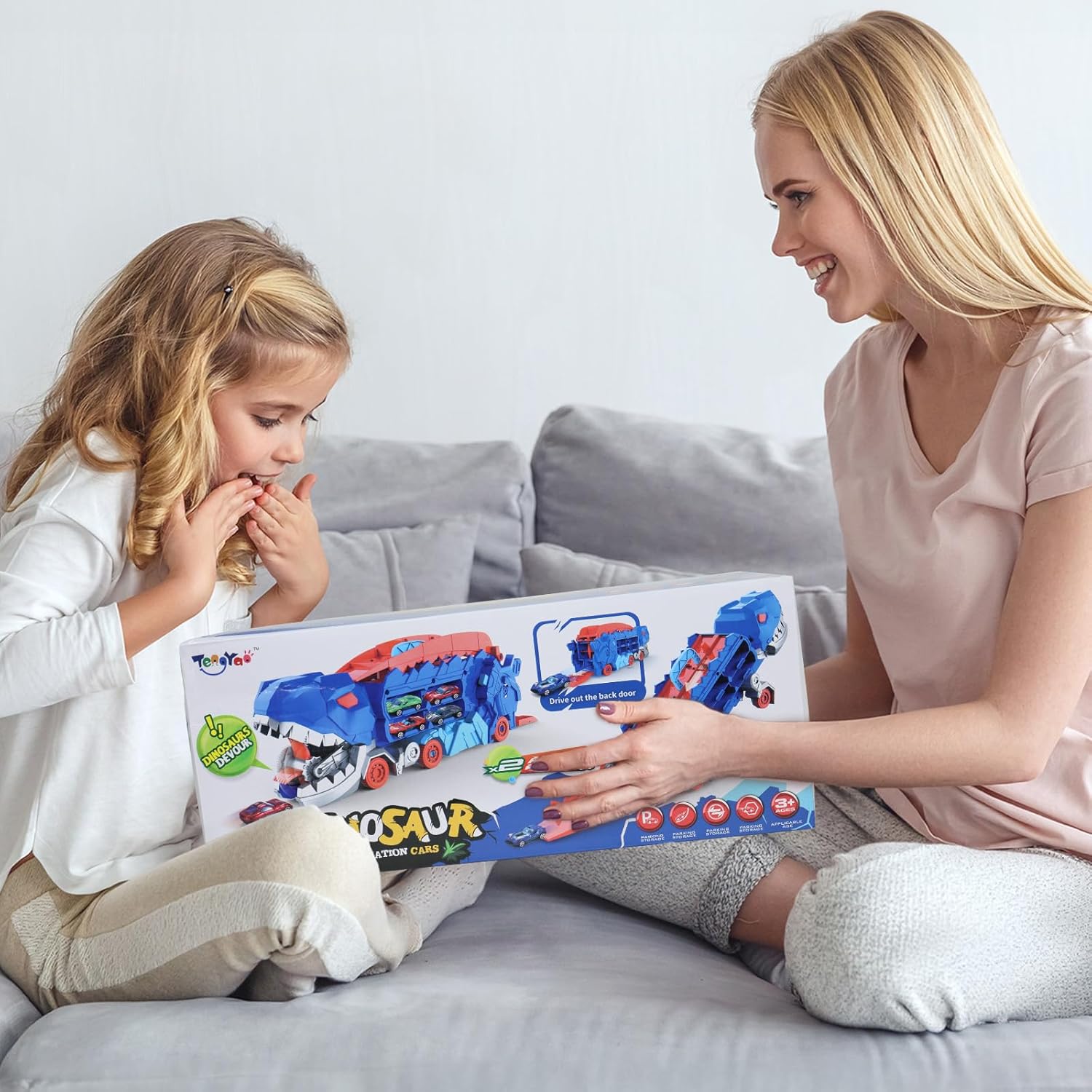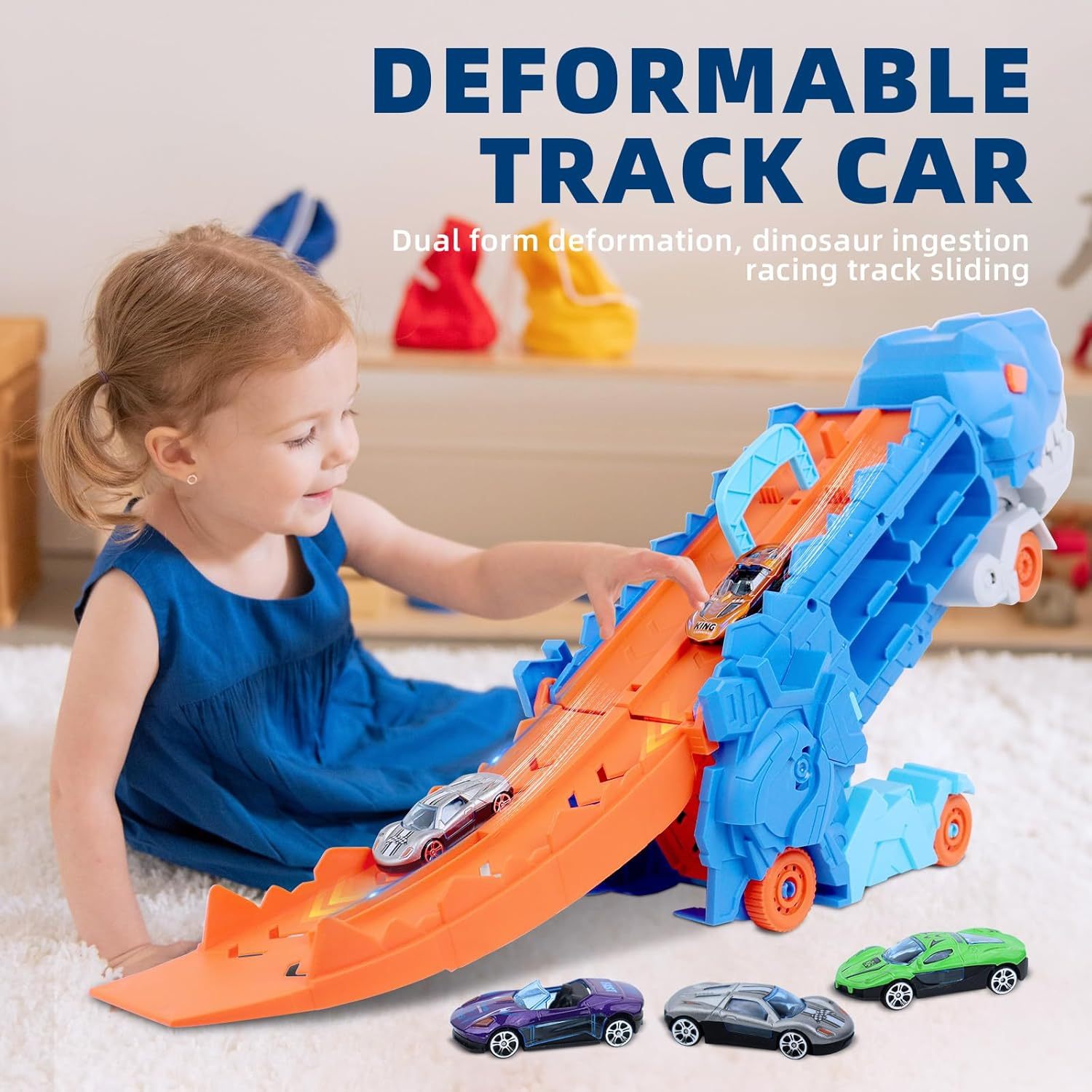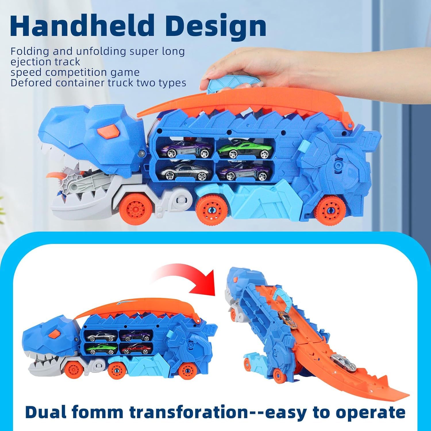 Aventura de dinosaurio de transporte multifuncional: ¡desata la aventura con nuestro coche de dinosaurio de transporte 3 en 1! Diseñado para niños de 3 a 6 años, es algo más que un coche: también es un espacio de almacenamiento con capacidad para 16 coches pequeños y una pista de carreras de dos filas para emocionantes carreras. Transfórmalo en un dinosaurio de pie para despertar la imaginación.