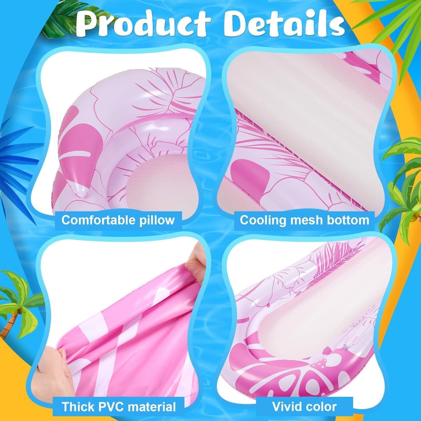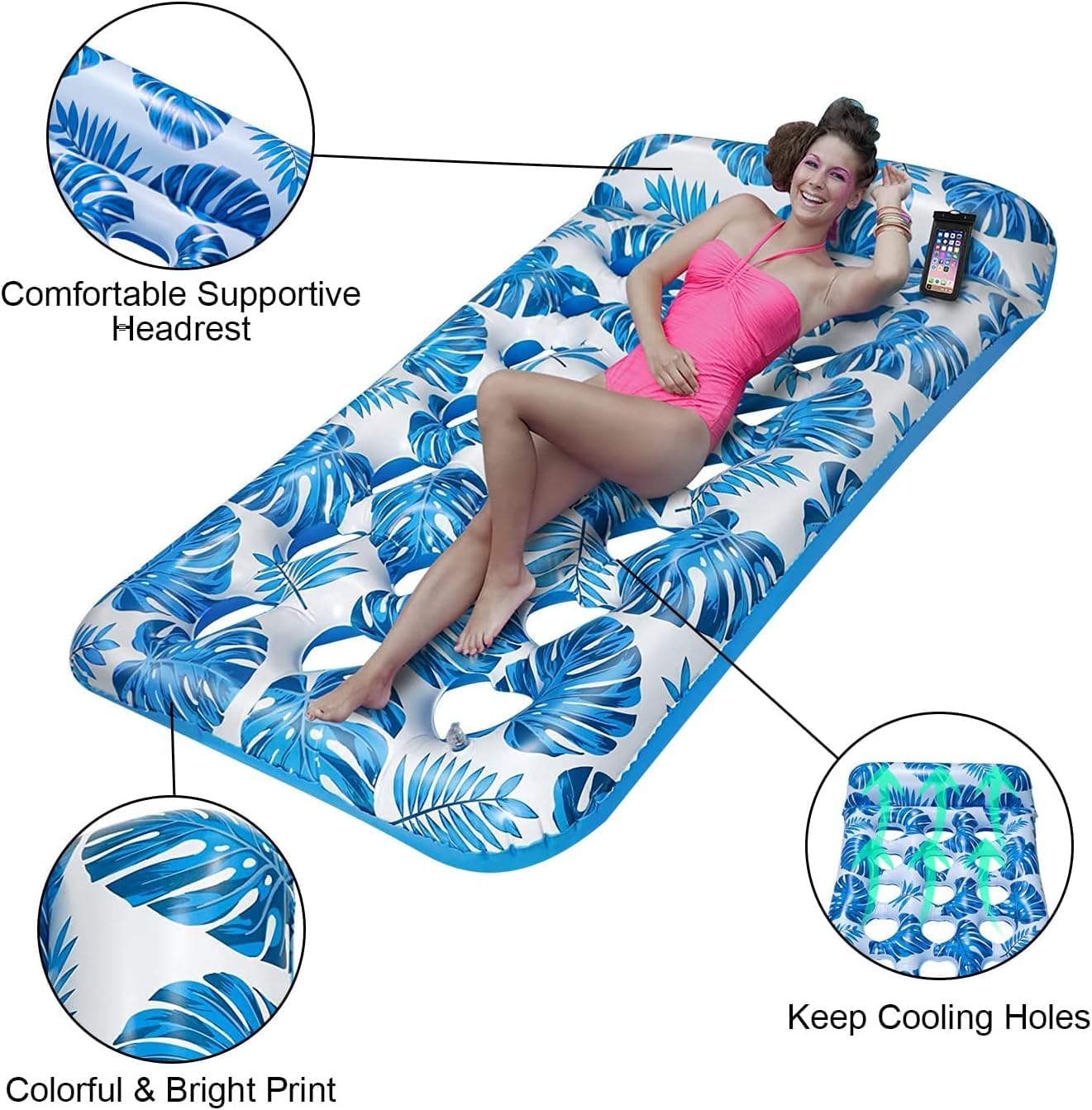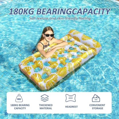 🏊【Flotador de piscina ultra cómodo y refrescante】Presentamos 2 colores brillantes de flotador de piscina inflable: tu compañero ideal para un verano perfecto. A diferencia de los flotadores de piscina comunes, nuestros flotadores vienen con un cómodo reposacabezas y 21 orificios de enfriamiento por flotador. Estos agujeros aumentan la transpirabilidad, permitiendo que tu piel disfrute del contacto directo con el agua refrescante.