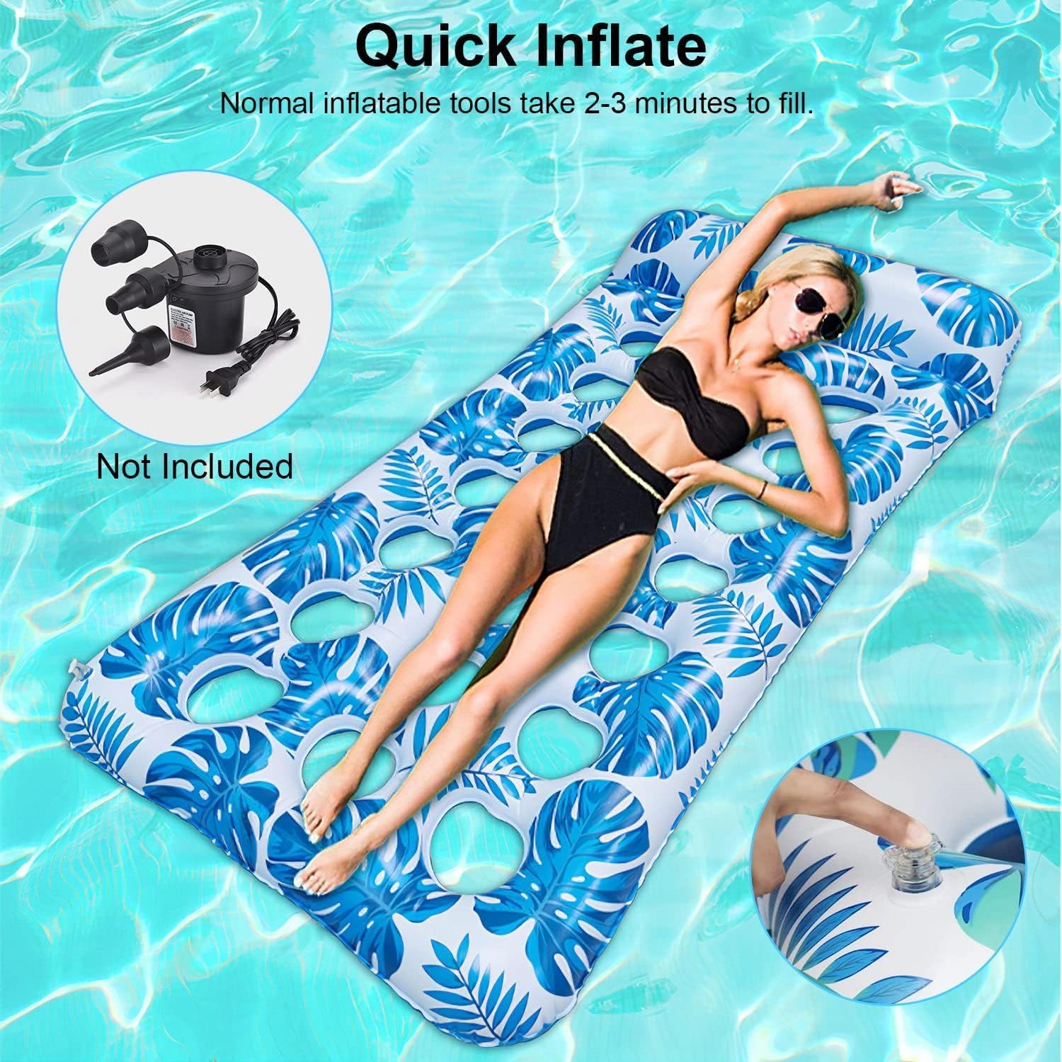 🏊【DISEÑO EXPANSIVO E INFLADO RÁPIDO】Estos flotadores de piscina alargados y ensanchados están diseñados específicamente para adultos, midiendo 68,9" x 31,5". Ideales para adultos de menos de 300 libras, se inflan y desinflan fácilmente con válvulas de doble acción. Con una bomba eléctrica (no incluida), puede inflarlos en solo 2-3 minutos.